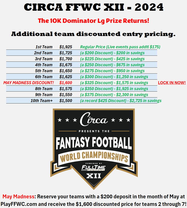Entry Fees$25/$50/$150 Circa Las Vegas Fantasy ChampionshipThe largest league prizes in the industry for a mid-stakes entry. This year, there are 3 options for drafts. Online drafts, online slow-drafts and Live Drafts in Las Vegas. Online slow-drafts drafts are available and draft the next day upon being filled. PrizesIndividual League Prizes: Up to $2,625 in lg prizing Grand Prize: $50,000 Entry Fees$349 per team - or save $100 on a 3-pack Fantasy Football World ChampionshipThe Main Event is the marquee draft of the Fantasy Football World Championships. Win your individual league and take home $10,000...the top overall team claims our $150,000 Grand Prize and a trip for two at Circa Resort & Casino in Las Vegas! Excited yet? If you don't feel like making the trek to Las Vegas, we've got a solution...join the Main Event online! PrizesWinner: $150,000 Grand Prize - $12,000 in League Prizes Entry Fees$1,925 per team, additional teams discounted* |